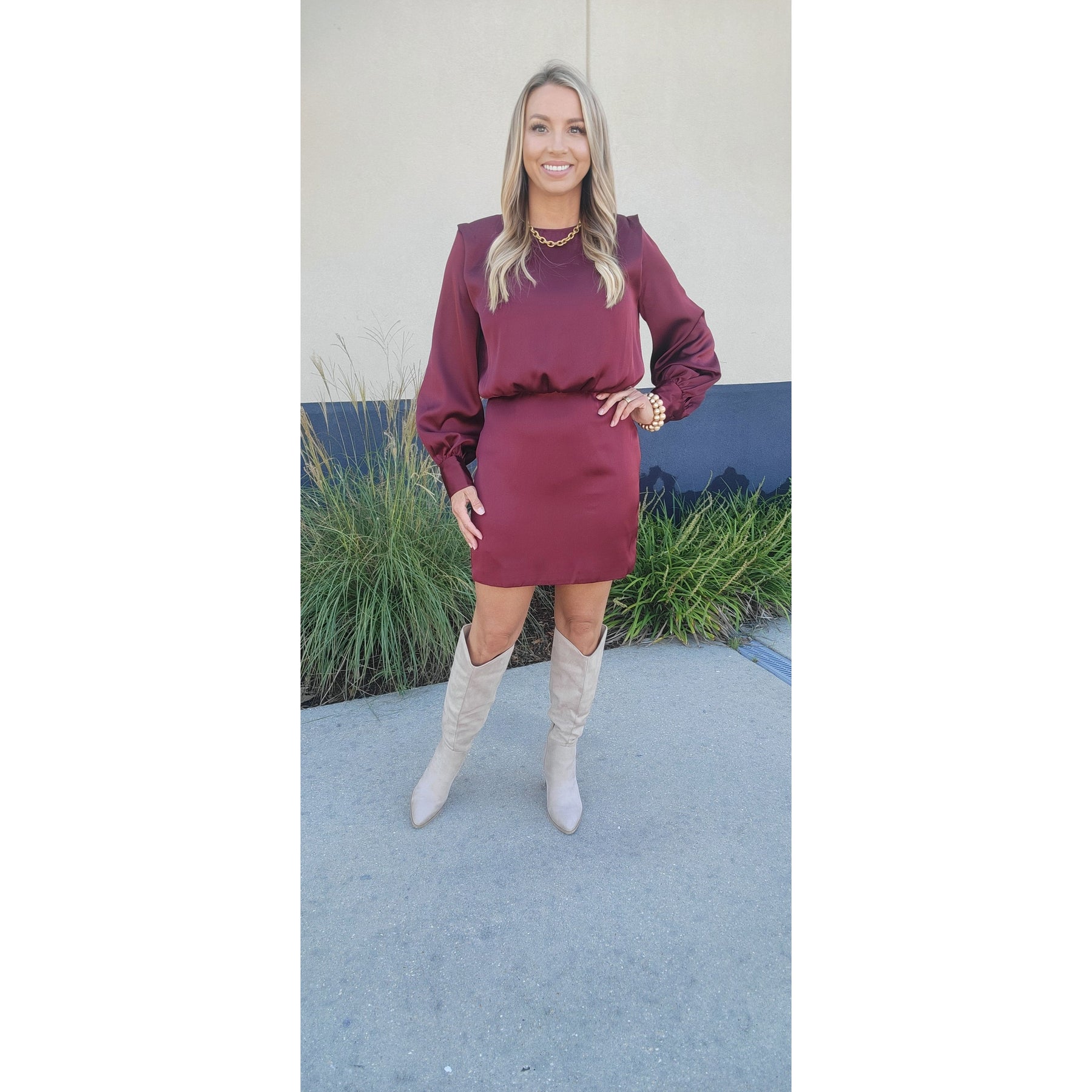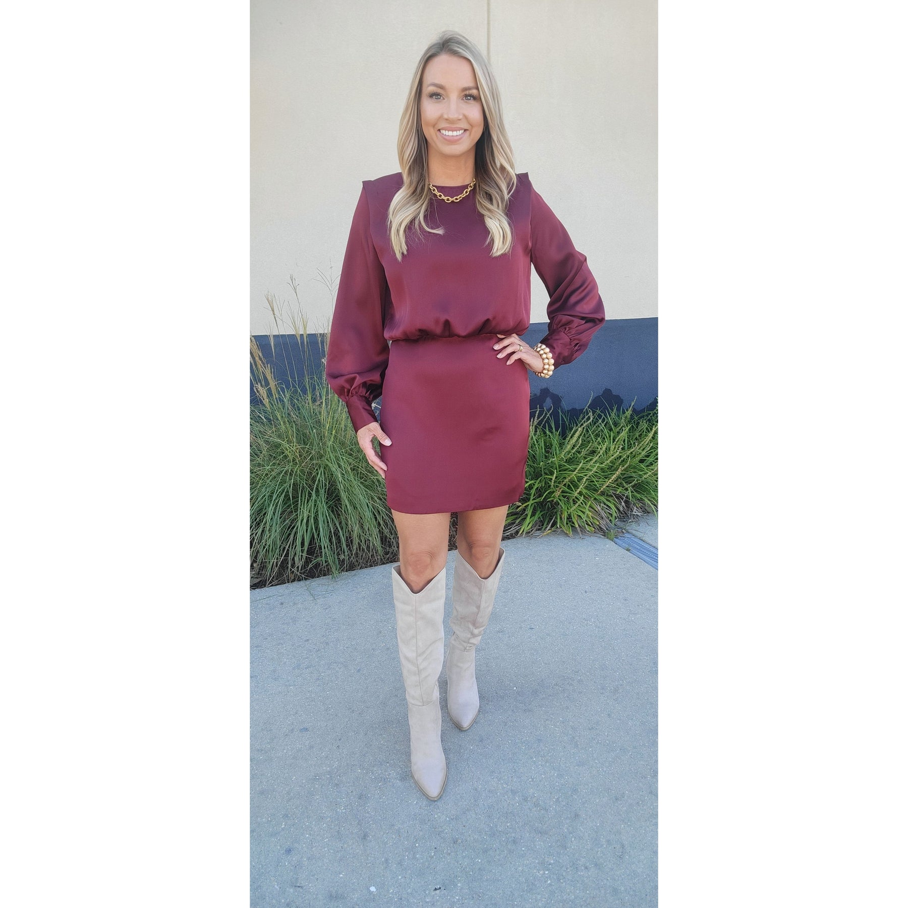 Elevate your holiday party look with the Cabernet Night Long Sleeve Dress. This satin burgundy mini dress wraps you in rich, festive color and a silky smooth feel that moves with you. Perfectly flirty with its mini length and long sleeves, it strikes the perfect balance between cozy and chic. Get ready to turn heads and dance the night away in effortless style!