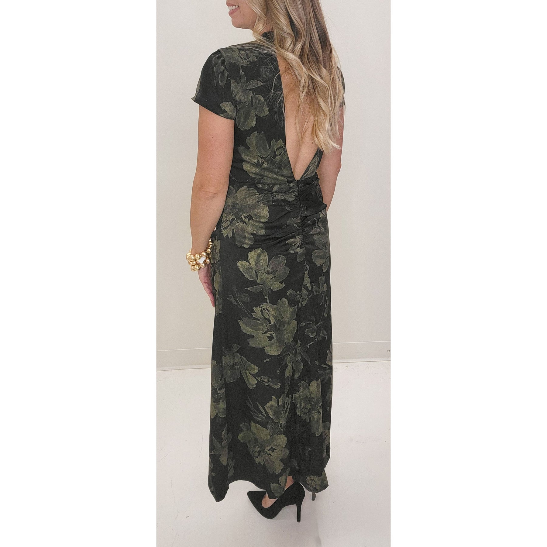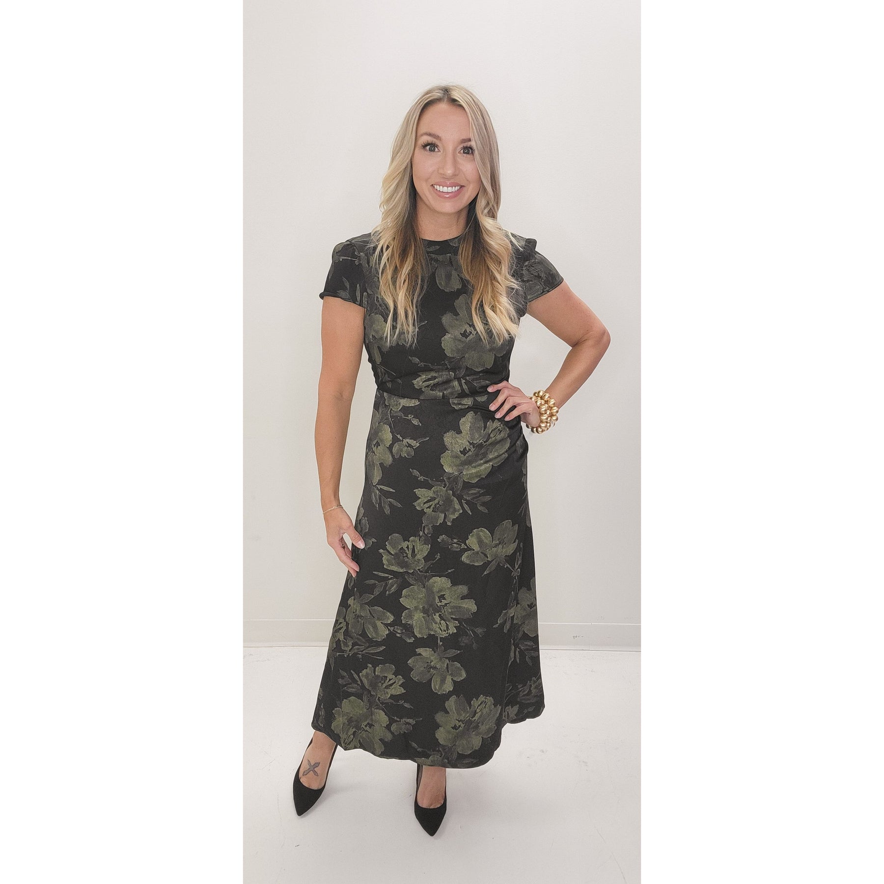 The Midnight Garden Midi Dress is the perfect choice for holiday parties or winter weddings. This floral print foil cap sleeve dress features a V-back with zipper and ruching, adding a touch of elegance and femininity. Don't miss out on this gorgeous dress that will have you turning heads all night long!
