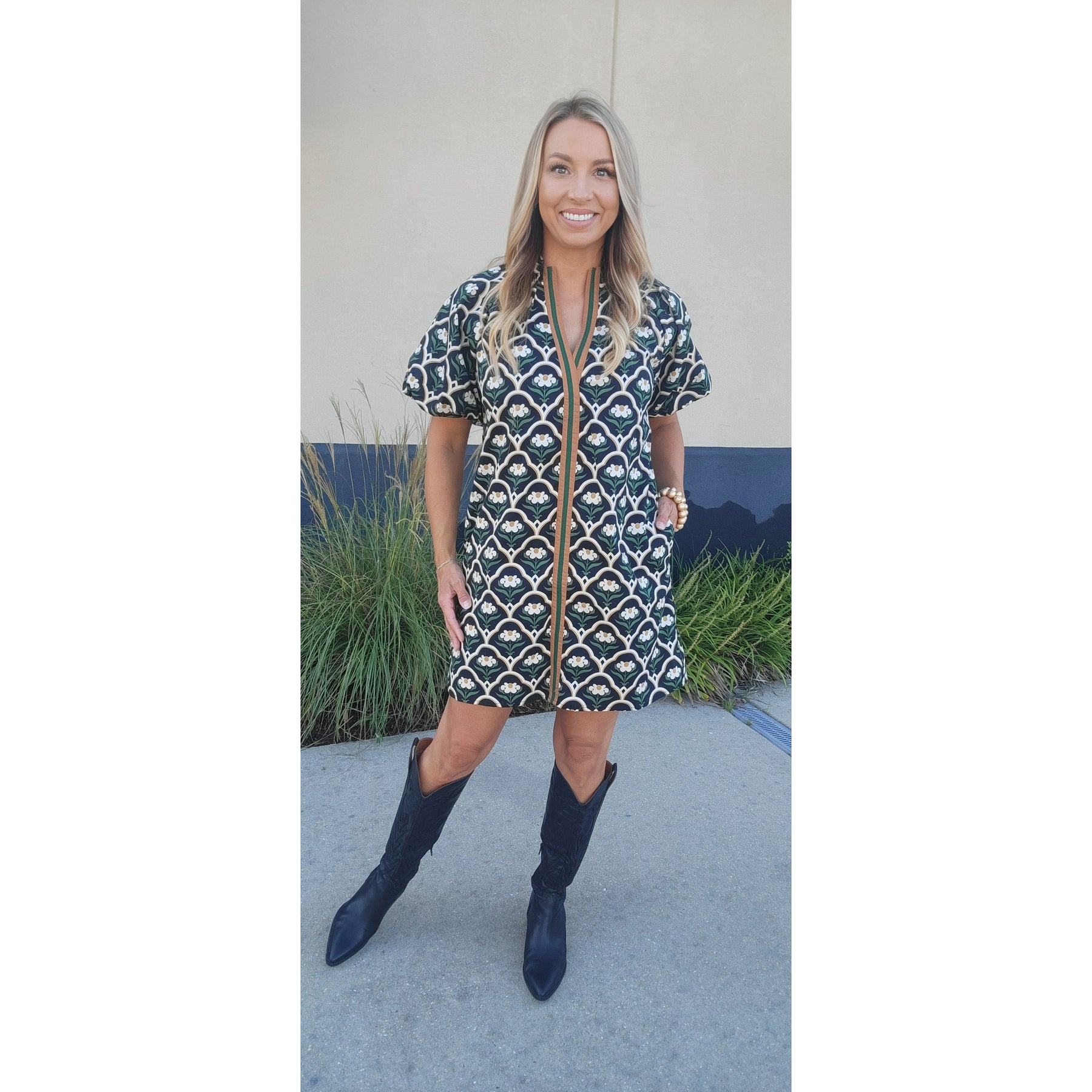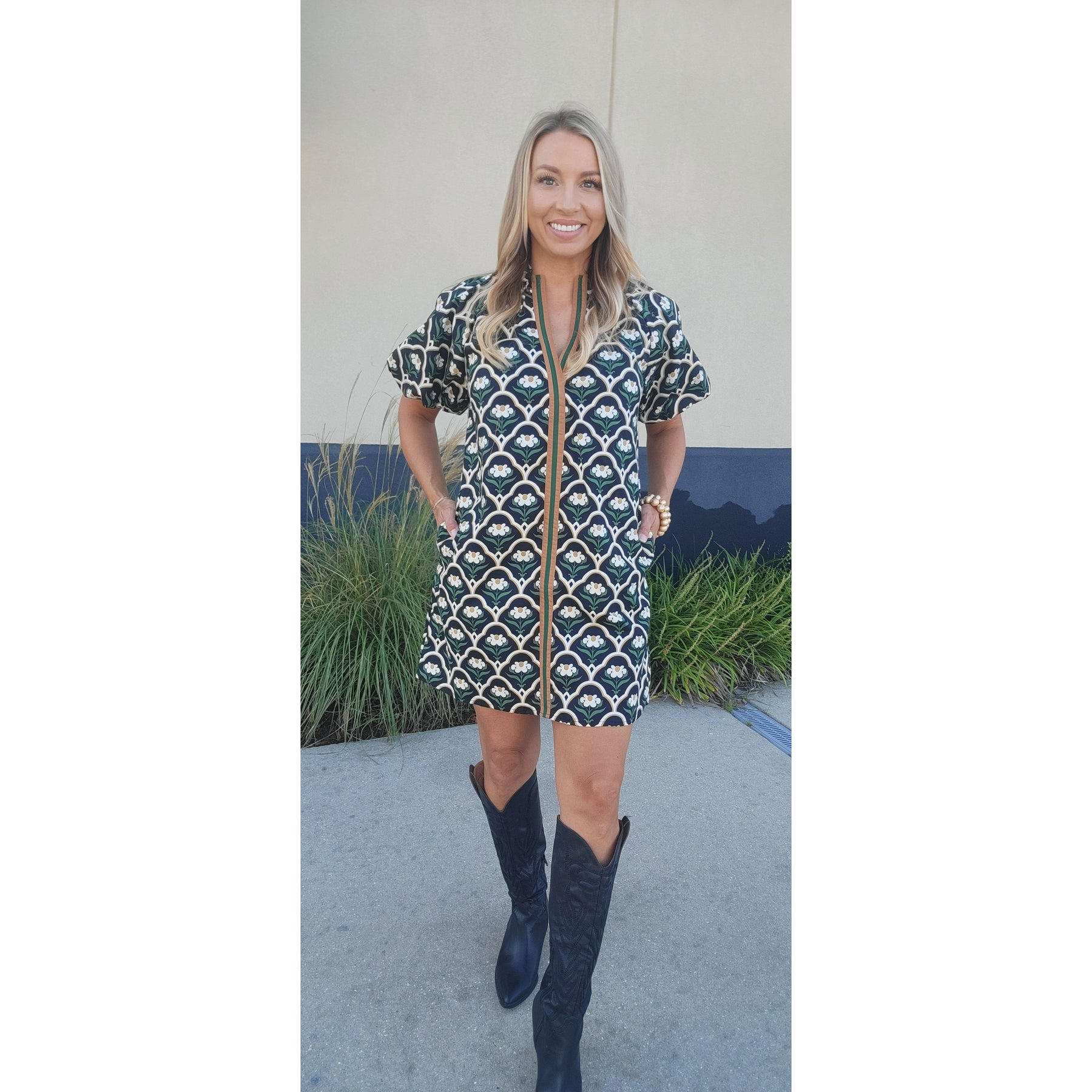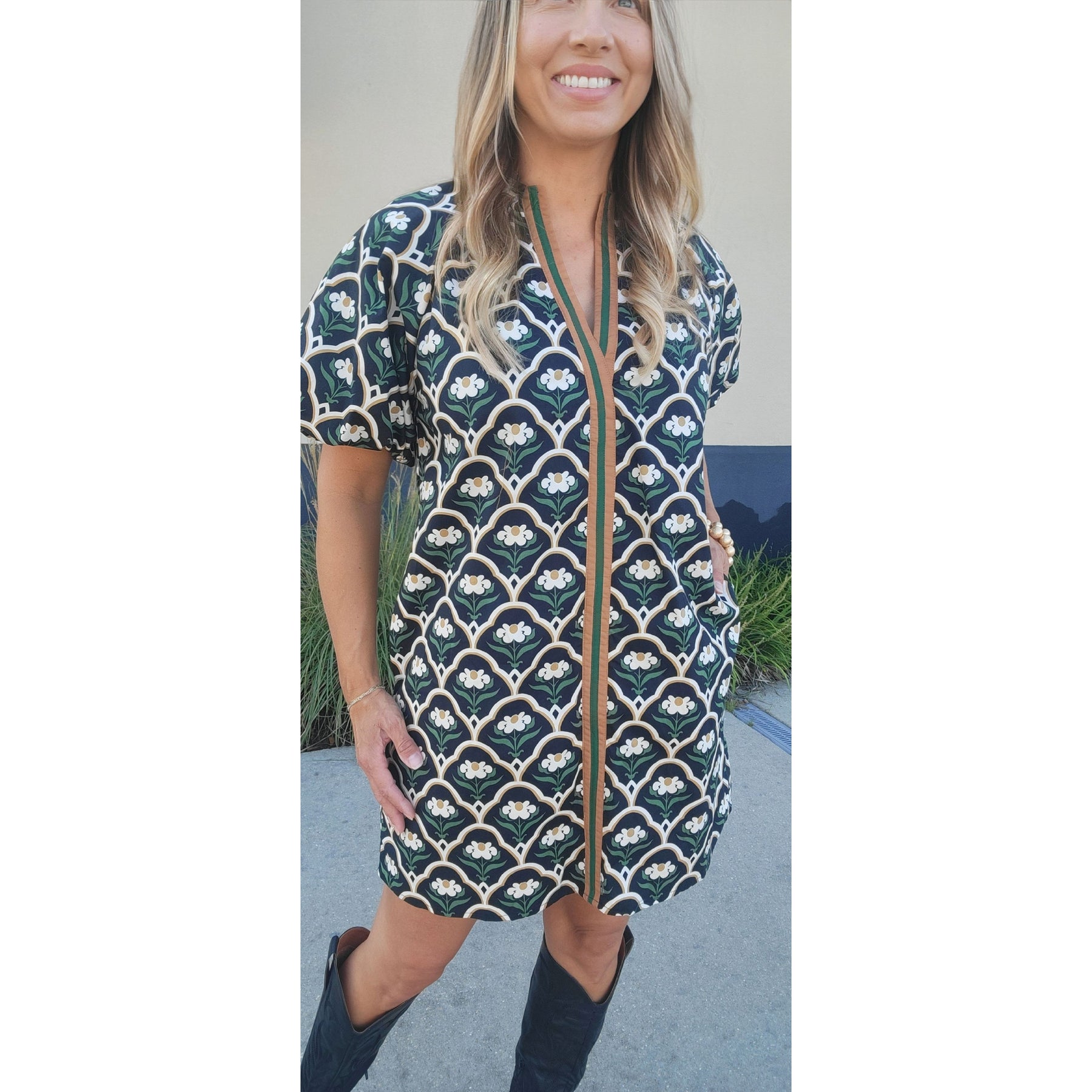 Step out in style with the Sienna Night Short Dress, a delightful blend of playful charm and effortless comfort. This lightweight woven dress features a vibrant botanical print with multicolor contrast binding trim that adds a fun pop to its short puff sleeves and ruffled V-neckline. Designed with convenient side pockets and fully lined for non-sheer coverage, it's perfect for twirling through warm days and breezy nights.