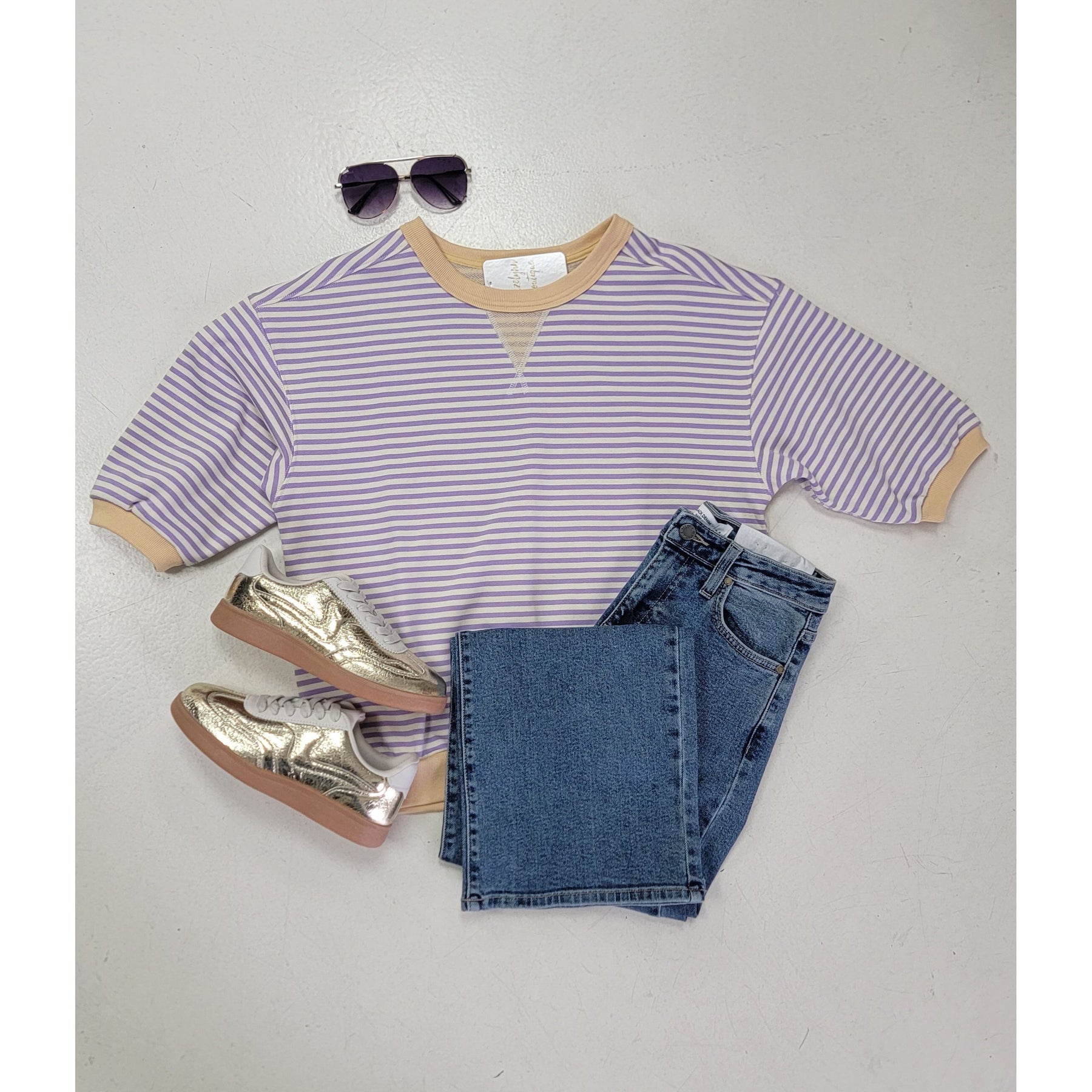 This charming short sleeve top combines lavender and white pinstripes with a striking yellow trim along the collar and sleeves, creating a fresh, versatile piece for your everyday wardrobe. The color-blocked design offers visual interest while remaining effortlessly wearable for running errands or casual outings. The breathable fabric and relaxed fit make it an ideal choice for warm weather, whether you're heading to the market, meeting friends, or simply enjoying your weekend. A dependable staple that transitions seamlessly from day to night.