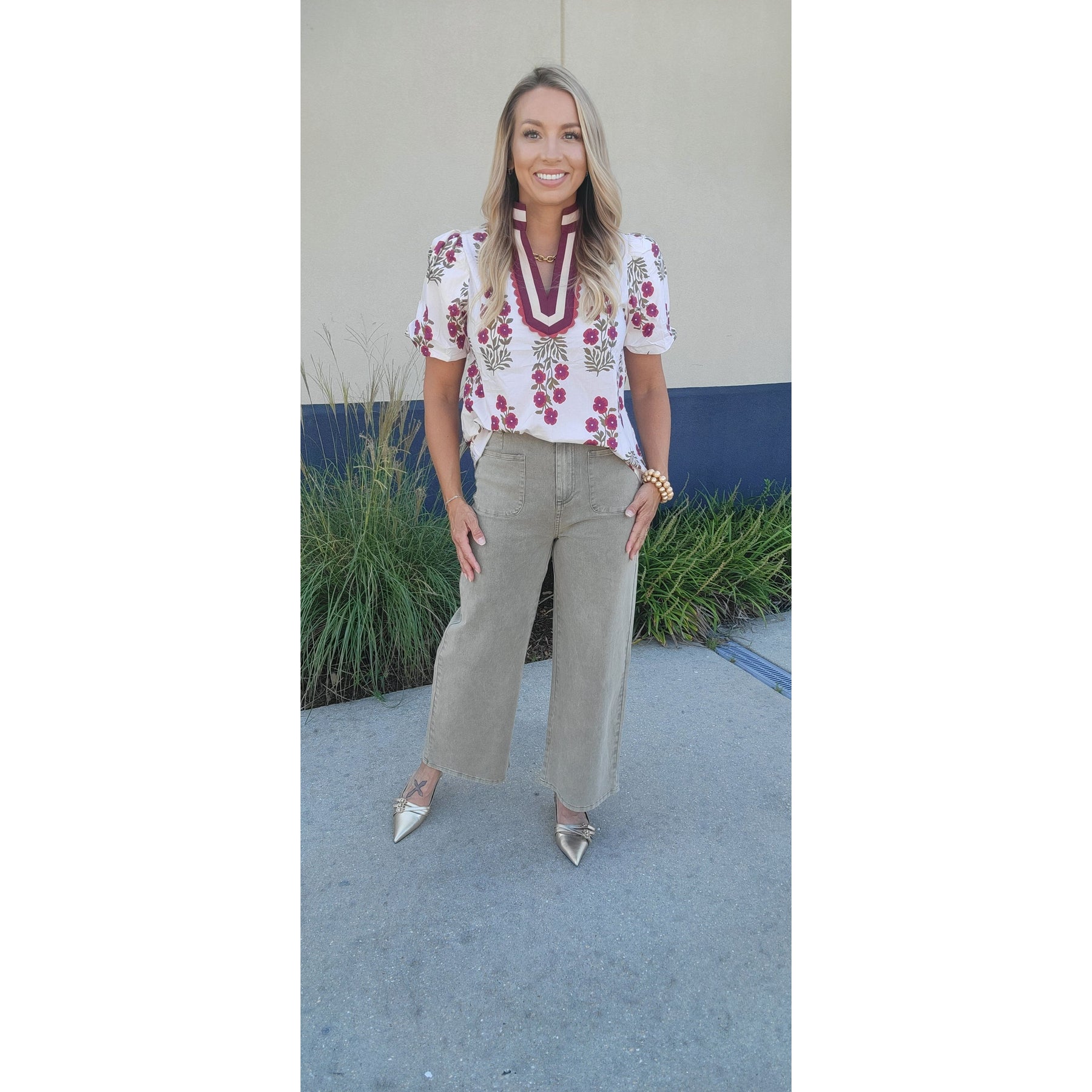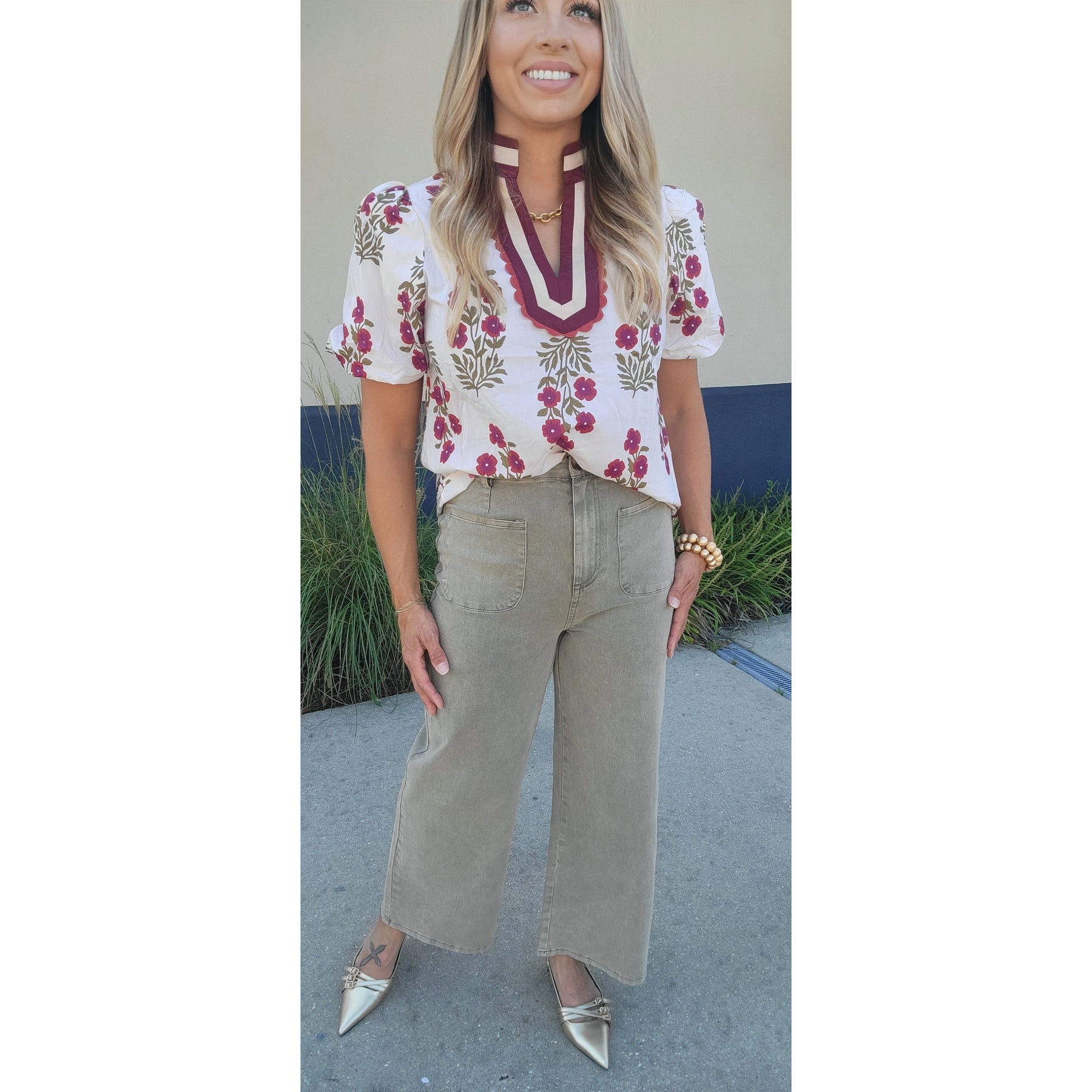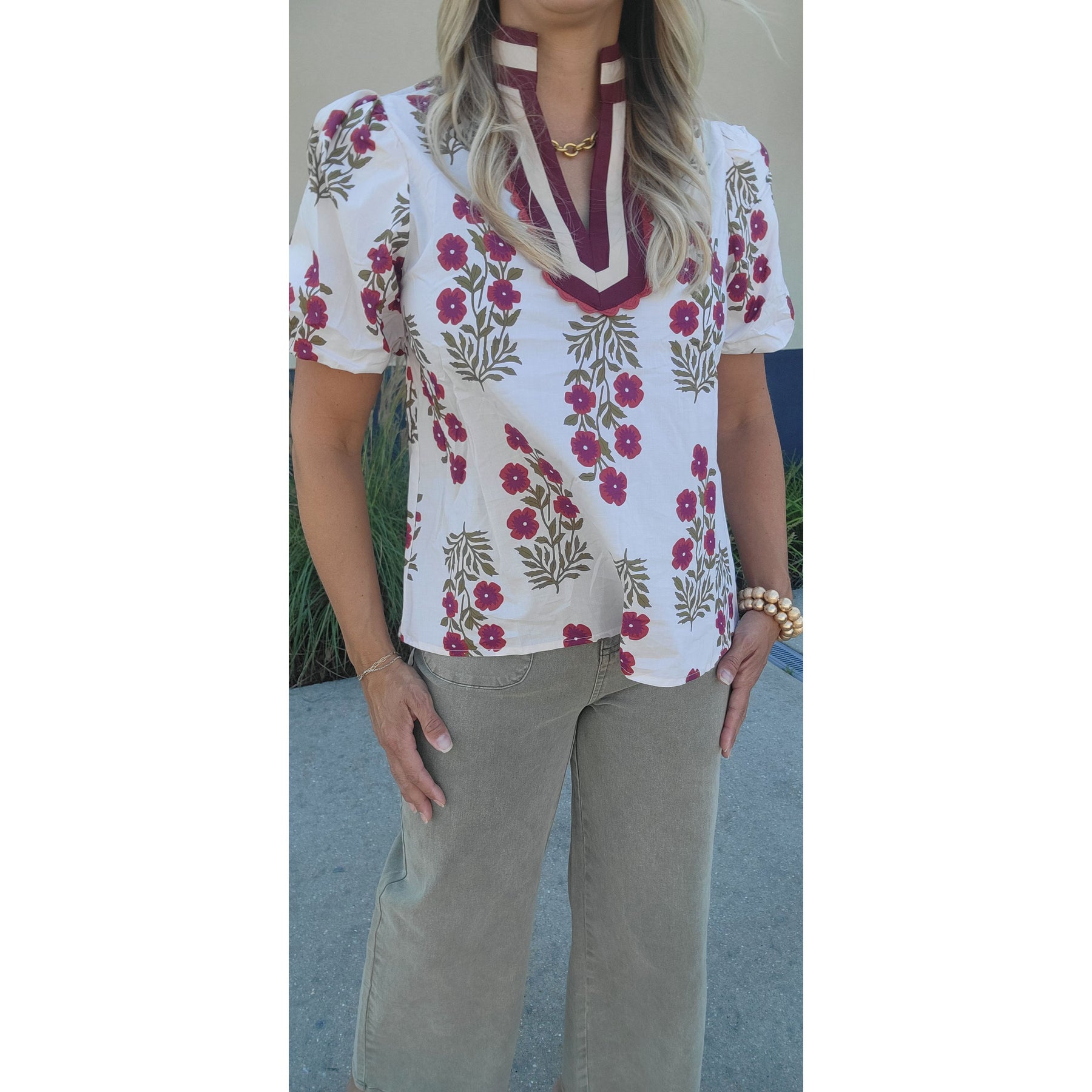 This playful burgundy floral top brightens up any holiday brunch with its charming print and comfy elastic short sleeves. The Marlowe is designed to keep you looking festive yet feeling relaxed, making it your go-to for celebrations that call for style and ease.