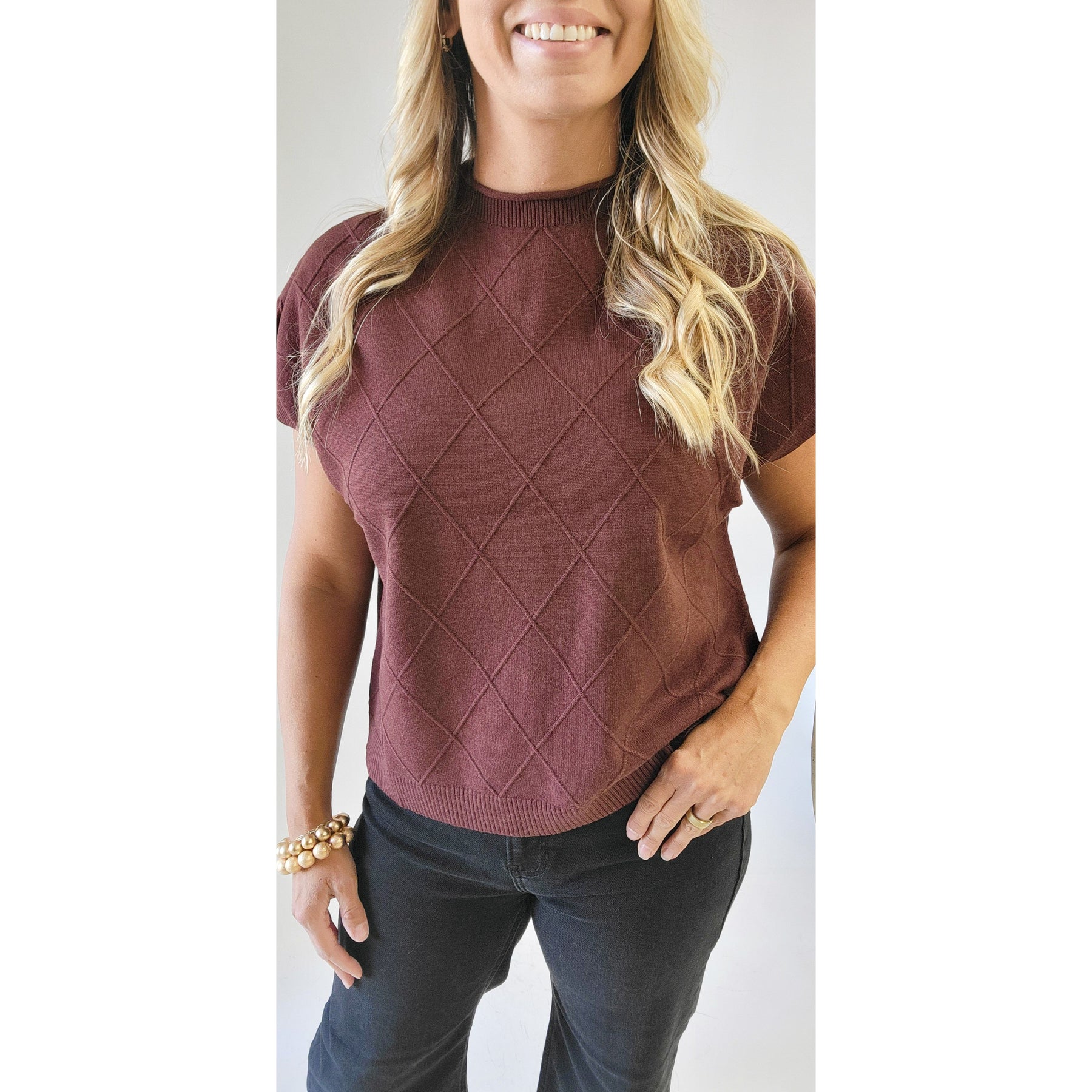 The Isla Chestnut Short Sleeve Top features a trendy drop shoulder design with charming lattice detail on the front, making it the perfect pick for Thanksgiving Day fun. Cozy yet stylish, it pairs effortlessly with your favorite denim and boots or sneakers for a laid-back holiday look you'll love to wear all season long.