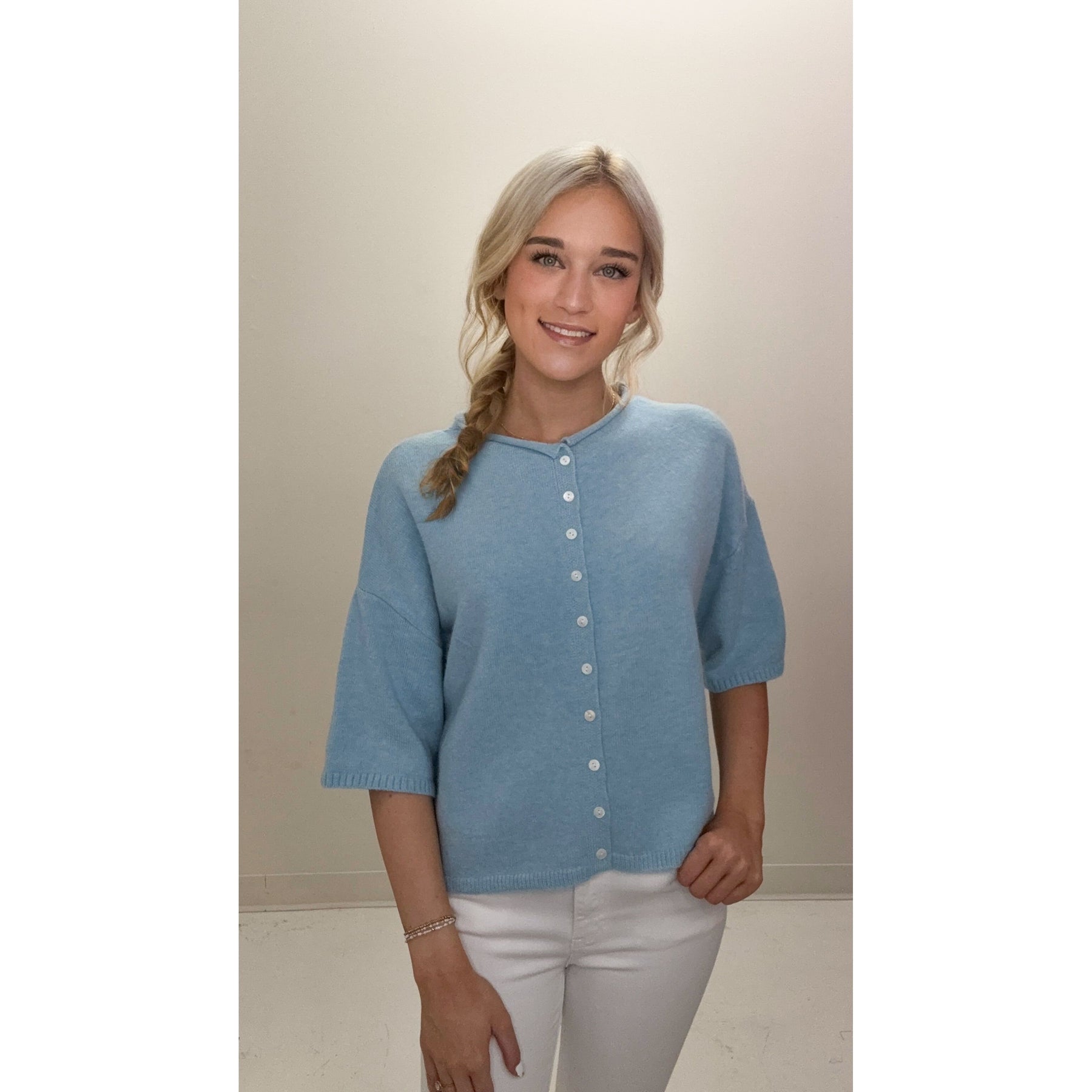 Effortlessly elevate your seasonal wardrobe with this powder blue button-up cardigan. The structured short-sleeve design offers versatile layering—drape it over a dress for refined spring transitions or pair with crisp white denim for a polished ensemble. Crafted with quality construction, this piece bridges casual and sophisticated styling with understated elegance.