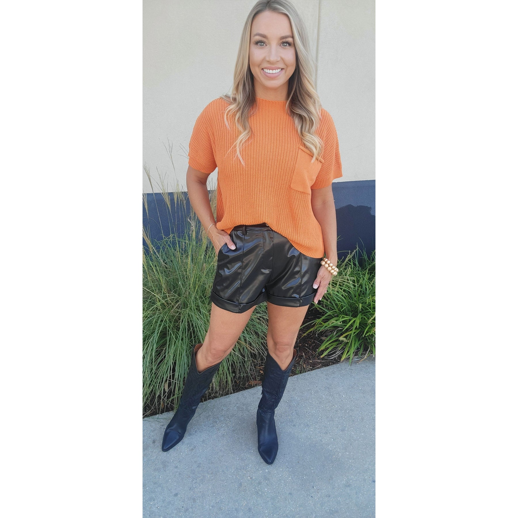 Cozy up in our Pumpkin Spice Sweater Top, featuring a trendy drop shoulder and short sleeves perfect for layering. The playful front side pocket adds a cute twist while keeping your essentials close. Soft and comfy, this sweater top lets you embrace the autumn vibes with effortless style.